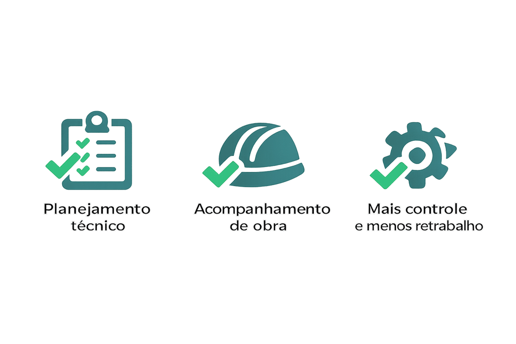 Projetos em BIM, interiores, renderização 3D e acompanhamento técnico para sua obra acontecer com mais clareza, controle e segurança.